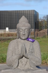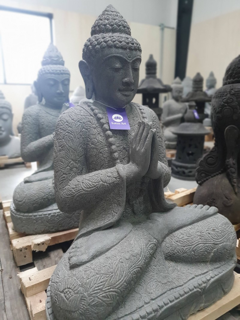 De Boeddha zit in de houding van de padmasana of "volle lotus". Zijn handen zijn samengevouwen in een gebaar van begroeting voor zijn borst. Dit wordt de anjali mudra of namaste handpositie genoemd. Hij heeft een lichte glimlach op zijn lippen en een knap gezicht omlijst door lange oorlellen. Hij is perfect voor in een tuin of binnen.