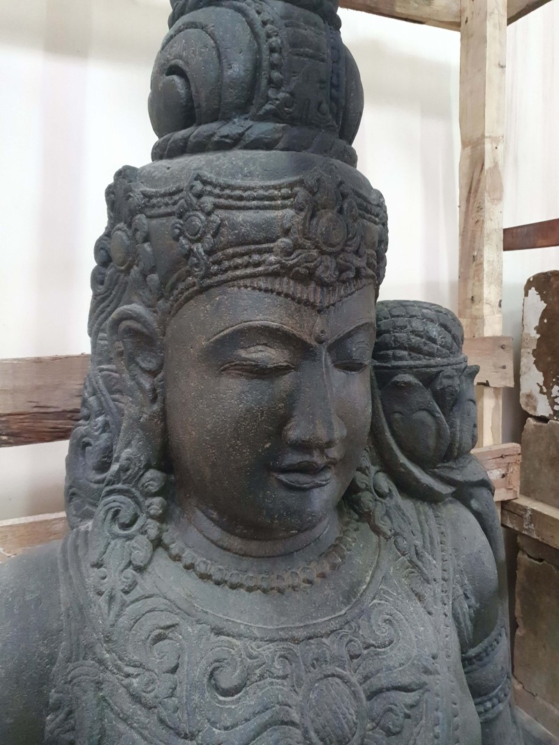 Dit beeld van de hindoe godin dewi tara en is met met de hand vervaardigd uit een stuk massief stuk groensteen door zeer getalenteerde beeldhouwers op het eiland Java in Indonesië.